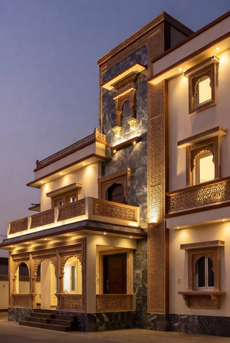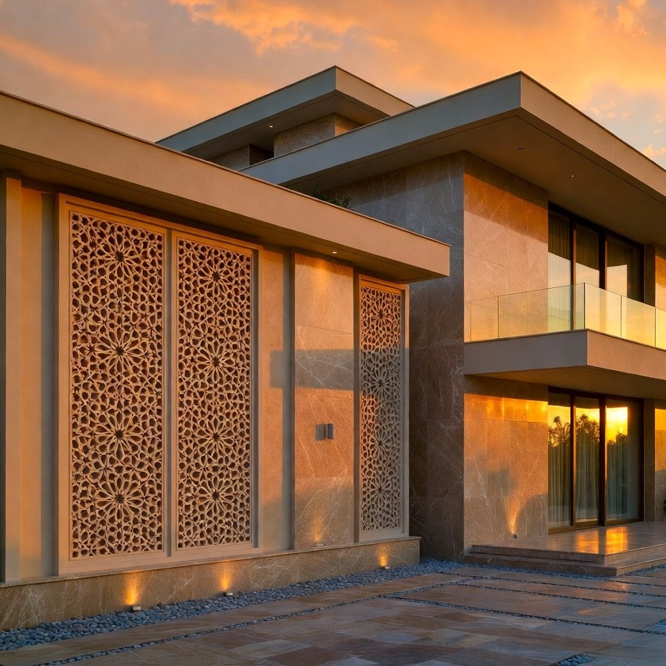 Elegant CNC-cut stone jali designs for house elevations, balconies, partitions and temple architecture.
